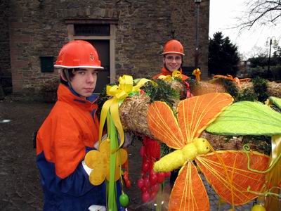 Feuerwehrkameraden einen üppig geschmückten Osterkranz samt Mast
