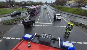 Ein Pkw hatte sich überschlagen und kollidierte mit einem Bus. Die zwei Insassen des Pkw wurden leicht verletzt und vom Rettungsdienst versorgt. Niemand war eingeklemmt. Die Löschzüge 2 bis 4 konnten auf der Anfahrt bereits ihren Einsatz abbrechen. Die Einsatzkräfte der Feuerwehr unterstützten die Beamten der Polizei. Für die Dauer der Arbeiten blieb die Kreuzung gesperrt. |